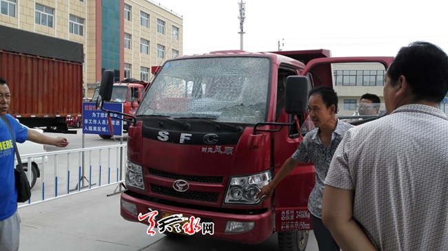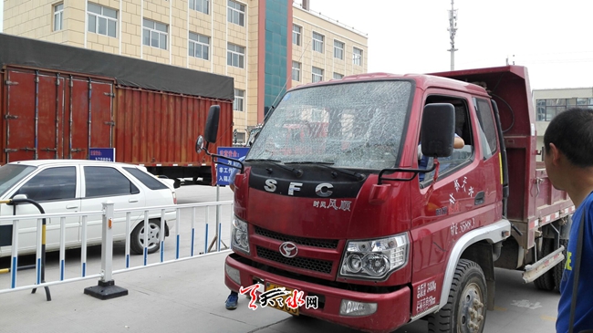 天天天水网10日9时讯【记者苏中豹】当日上午,在我市某一汽车检测机构现场,一辆卡车前挡玻璃被前面受检车辆轮胎夹沟摔出的石子击碎。