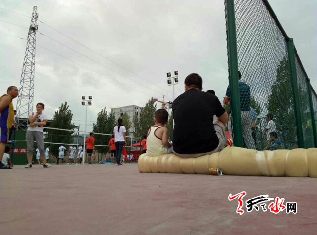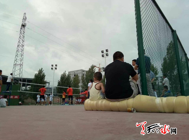 天天天水网10日16时讯【记者 何慧娟】8月10日,在甘肃省工业职业技术学院的排球场,激烈的比赛正在进行。在球场的边上,有一个约两岁多的小孩坐在父亲旁边,不哭也不闹,只是专心致志地观看比赛,在大小背影的衬托下,整个画面显得和谐又安详。
