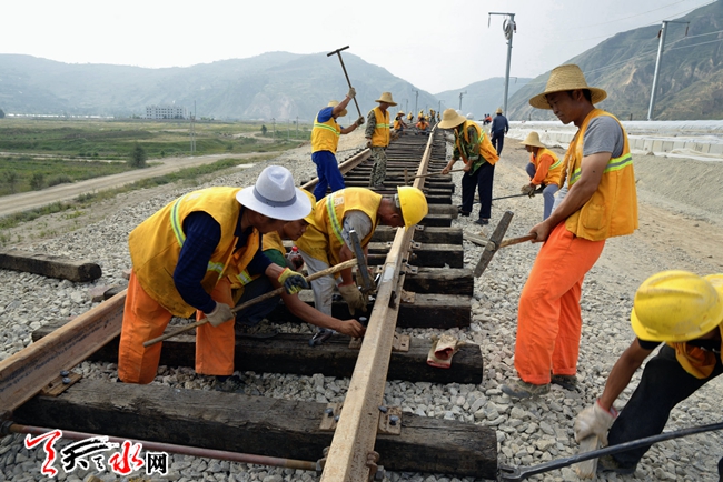 8月9日,工人们正在宝兰客专天水段麦积区三阳川铺轨基地进行牵出线施工。宝兰客专在我市境内全长162.9公里,途经秦州、麦积、秦安三县区。该项目预计2017年建成通车,届时我市到兰州、西安的时间将缩短至2小时以内。(通讯员朱卫华 摄)