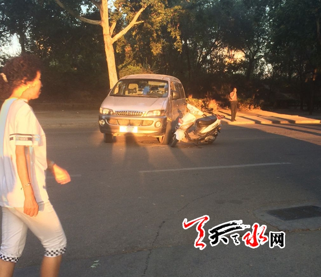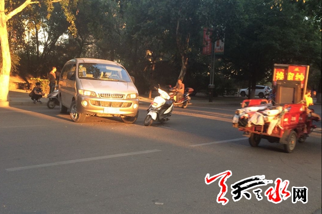 天天天水网19日30时讯【记者杨晓斌8月11日19时30分许,秦州区新华路建三小学附近,一辆电动车与一辆小汽车发生刮擦相撞,所幸并无人员受伤。
