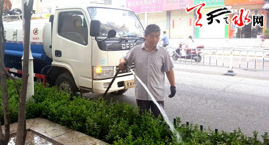 在采访过程中,记者在民主东路看到一辆秦州区园林处的浇水车,一位师傅正拿着水管给绿化带浇水。他说,最近他们早上7点半就开始给绿化带浇水,一直到半夜十一、二点才休息。