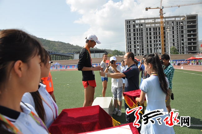 (女子跳高决赛第三名天水姑娘魏凯丽接受颁奖)