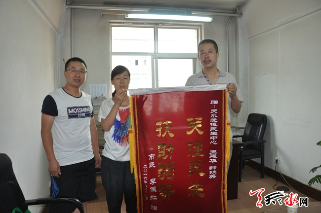 天天天水网18日12时讯【记者 常亮】8月18日上午,市民李女士带着一面写有“关注民生 扶助弱势”的锦旗来到天水晚报编辑部,对天水晚报记者王建华及韩铁英对她的帮助表示感谢。