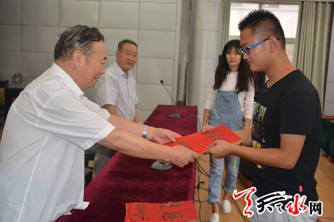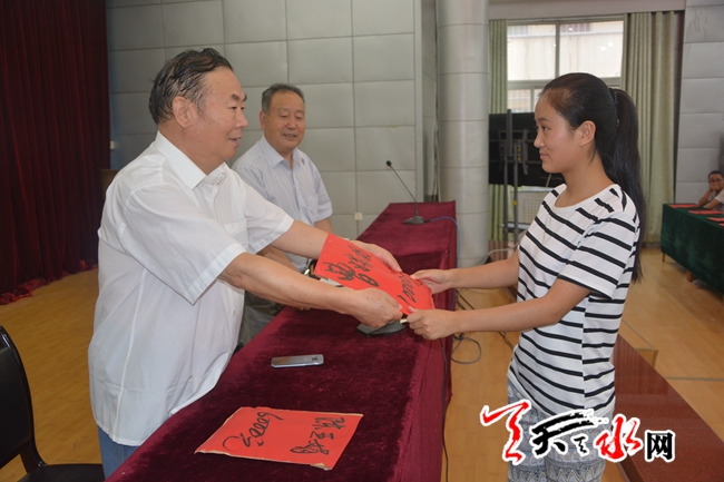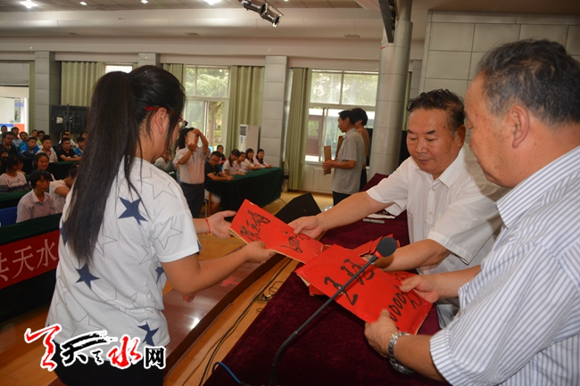 天天天水网2日18时讯【记者 蔚军平】9月2日17时许,今年考上大学的秦州区高考复读四部学生曹媛媛从学校校长手中接过了10000元的爱心助学金。