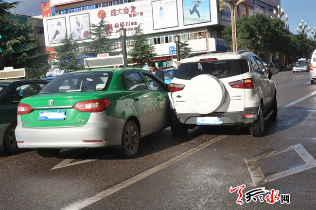 天天天水网6日14时讯【记者 常亮】9月6日上午10时许,在秦州区重新街北口发生一起出租车与私家车碰撞交通事故,该事故导致出租车与四家车不同程度受损,人员并无大碍。