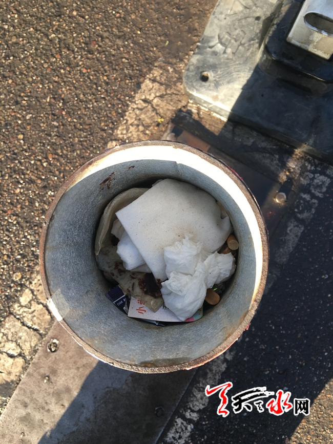 天天天水网8日15时讯 【记者甄娜】自我市开始实施道路管制,在秦州区的中心路段设置了上下路段隔离路桩后,作为公共设施的路桩成了一些过马路的市民的垃圾筒。在位于民主东路的几个路桩,一些市民随手将烟头、卫生纸等垃圾塞进了路桩口里。