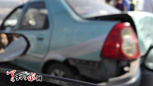 天天天水网9月10日讯 【记者 杨晓斌】9月10日10点10分秦州区藉滨大桥上发生三车连续追尾事故,一辆出租车别夹在中间,前后受到夹击后的出租车出现严重变形,所幸并无人员伤亡。