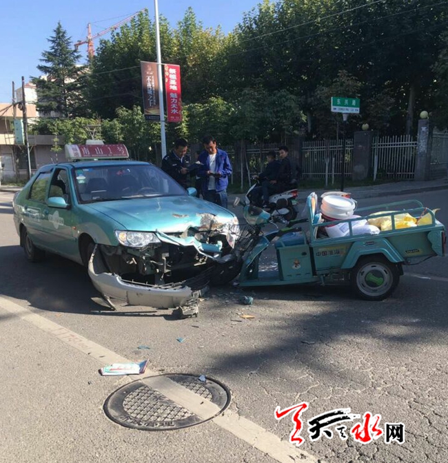 天天天水网21日17时讯【记者 常亮】9月21日下午4时30分许,在天水市藉河南路东兴路北口发生一起出租车与电动三轮车相撞交通事故。所幸只是两车不同程度受损,人员并无大碍。