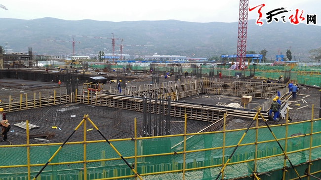 9月20日,天水体育中心游泳馆建设工地正在紧张施工。天水体育中心项目总投资6.43亿元,将建2万座(位)体育场、5000座(位)体育馆、1500座(位)游泳馆,以及体育运动学校和全民健身中心,计划于2018年建成并投入使用。(天水日报记者何郁 摄)