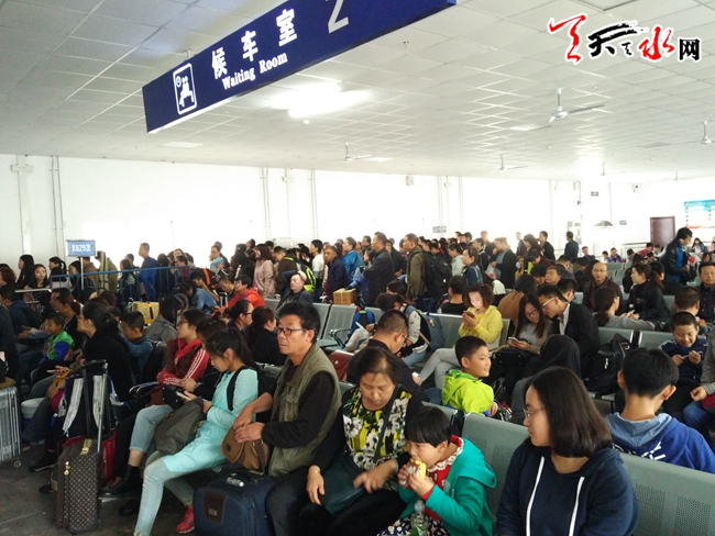 10月7日,天水火车站迎来了国庆“小长假”旅客返程高峰。为确保返程旅客快速有序进站登车,车站启动2个候车大厅,加强人员疏导,引导旅客有序进站登车。(记者周文涛 摄)