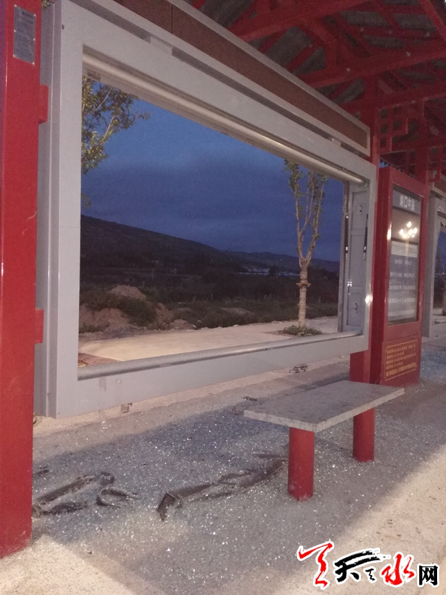 10月4日,记者在天水市成纪大道麦积区峡口村附近看到,两个相邻的公交站牌玻璃被人砸得粉碎,只剩下空荡荡的站牌边框立在站台上,玻璃碎片散落一地,看起来触目惊心。在此对恶意破坏公交站牌的不文明行为予以谴责。(记者苏中豹 摄)