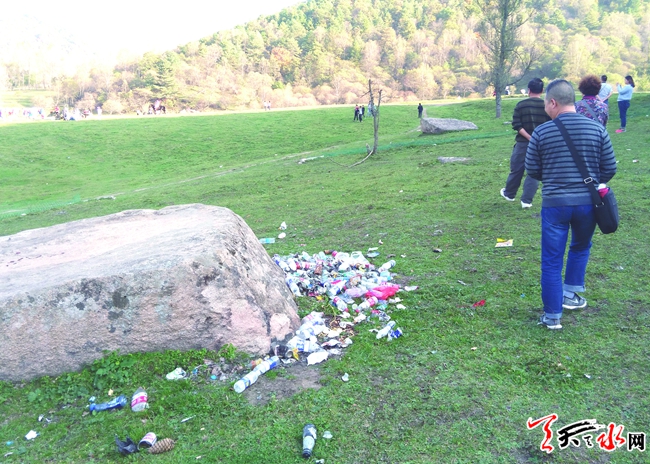 国庆节期间,记者在张家川县马鹿林场关山牧场看到,来牧场游玩的游客很多,草地上到处都能看到果皮果核、食品袋、饮料瓶等垃圾,其中有两大堆垃圾随意堆放非常扎眼,还有一条小溪内扔满塑料袋及矿泉水瓶,与绿色的草场及周围美景格格不入。在此,希望相关部门加大对垃圾的清运力度,并能在景区安放垃圾筒,便于及时收集、处理垃圾。 (记者王建华 摄)