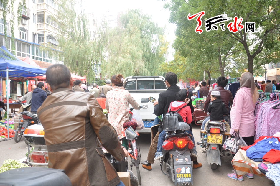 天天天水网11日12时讯【记者 常亮】10月11日上午,记者途经秦州区永庆路时看到,位于永庆路道路南北两侧已被小商贩当做临时兜售的摊点,大大小小的摊点将整条永庆路近百米占了个严严实实,宽阔的道路甚至连一辆电动车通行都比较困难。