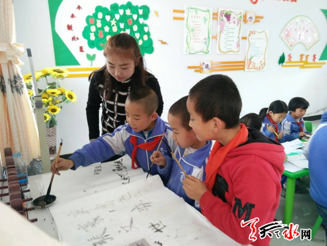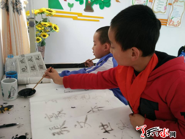 图为10月12日,二十铺村留守儿童之家的孩子在练习毛笔字。