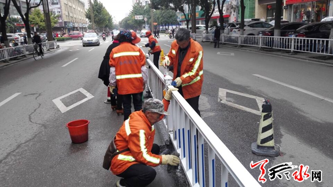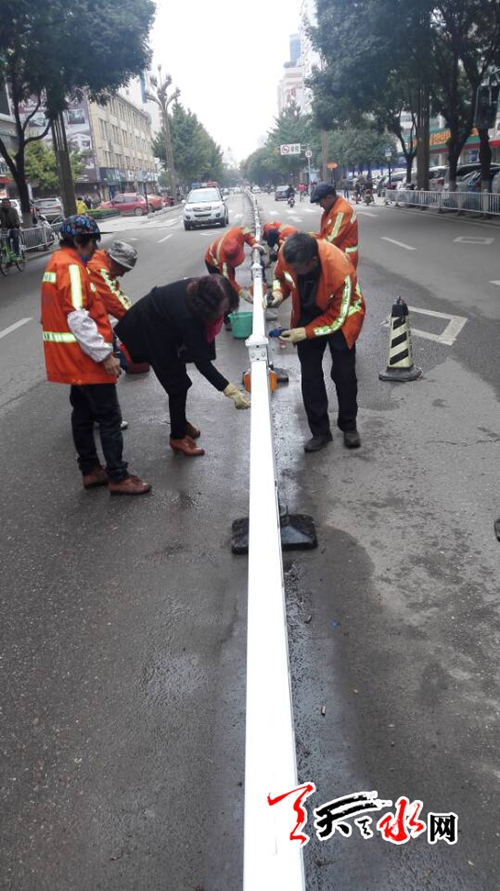 天天天水网13日11时讯 【记者 杨晓斌】10月13日,秦州环卫处大城所的环卫工人在下班自主擦洗隔离栏。工人们说,护栏的有些始角地方擦洗机无法擦到,为了让护栏显得干净漂亮,他们下班后自愿擦洗护栏。
