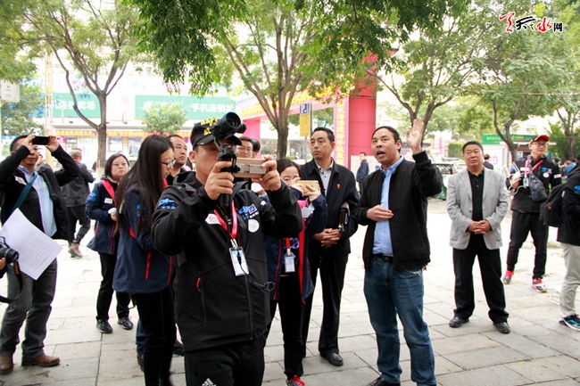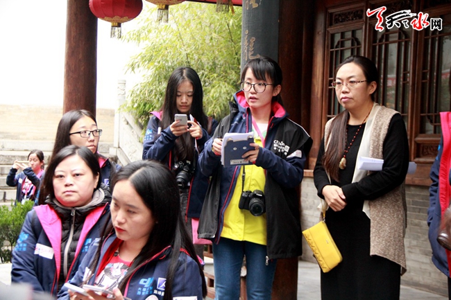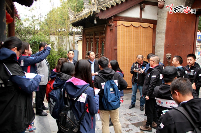 由国际在线陕西频道等多家网络媒体联合开展的“寻找丝路上的陕西元素—2016‘一带一路’网络媒体主题采访活动”10月9日在西安启动后,第一站便来到古丝绸之路必经之地“羲皇故里”天水。当日,采访团一行在始建于清乾隆年间的秦州区山陕会馆寻觅秦地和秦人遗风。(天水日报记者洪波 摄)