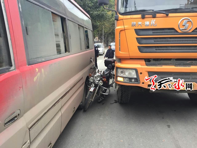 据现场目击市民反映,由于当时正值上班高峰期,该路段车辆严重拥堵,一位骑摩托车市民行驶在一辆大型货车与班车中间,由于货车欲左转行驶,将摩托车碰撞到班车上,摩托车主见状急忙跳车,所幸车速都不是很快。