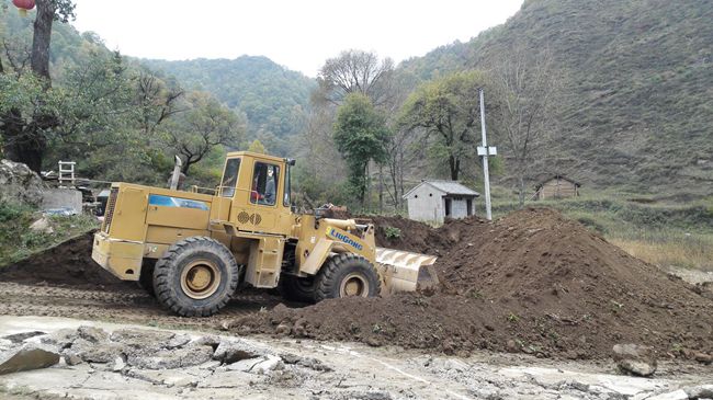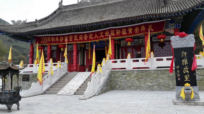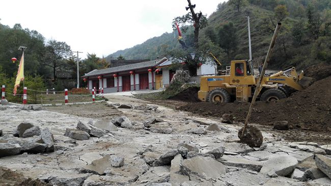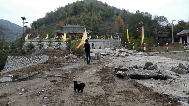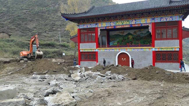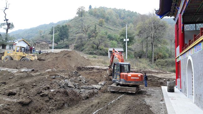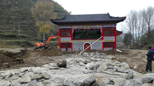 当日下午,轩辕宫新建成的戏台边工地上施工车辆来来往往,装载机挖掘机挖填着土方,一派繁忙。