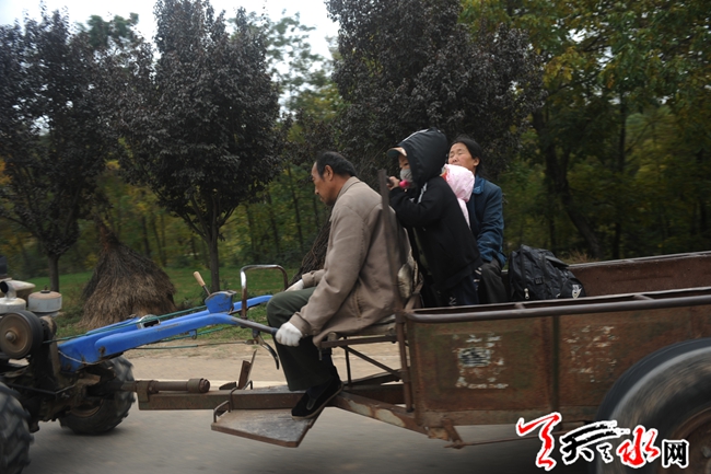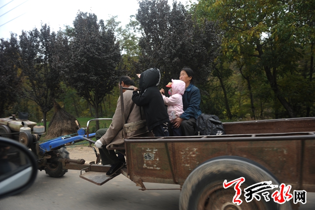 天天天水网24日15时讯 【记者 杨晓斌】清社公路清水县城南10公里处,一辆拖拉机载着两名儿童和一个大人前行。