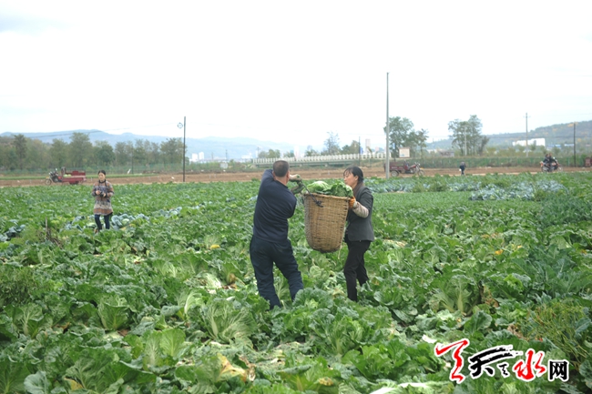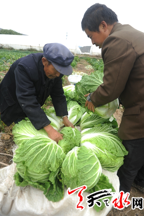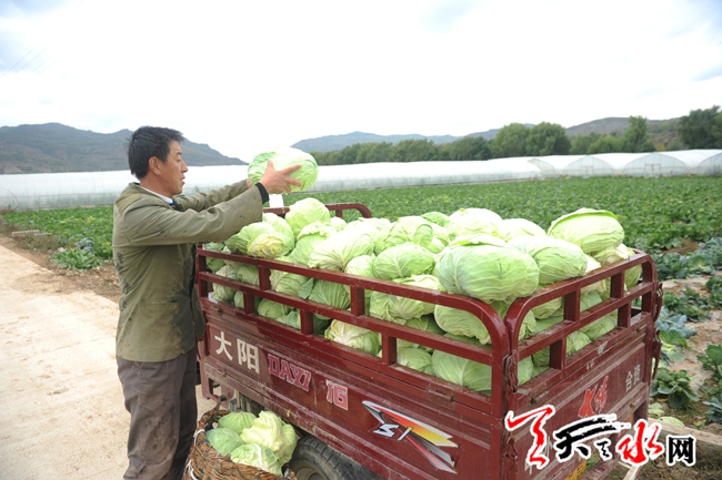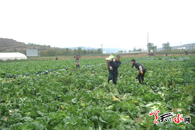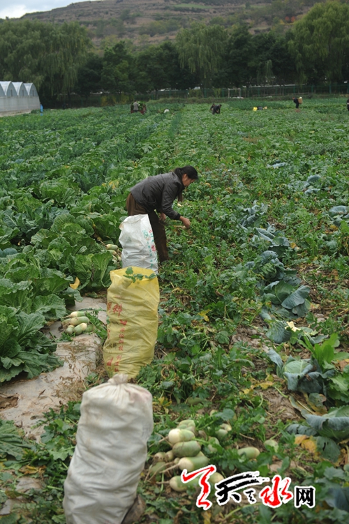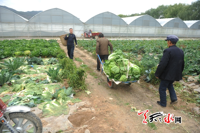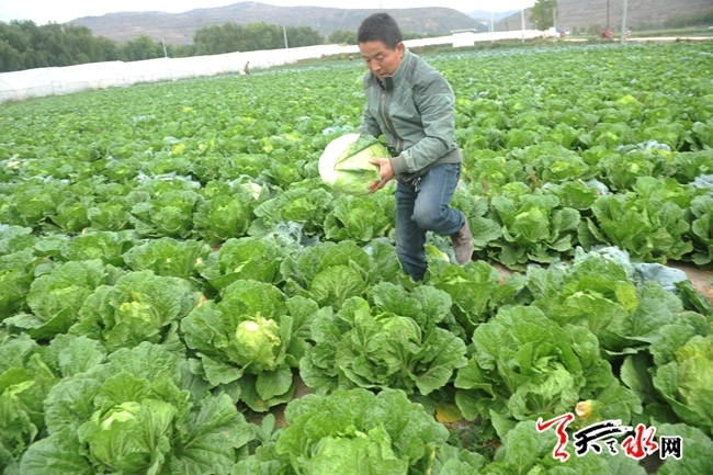 天天天水网24日17时讯 【记者 杨晓斌】“夏季的干旱导致今年的白菜欠收了!”10月23日,天水市菜篮子超市位于清水县红堡镇的蔬菜种植基地上,正在收摘白菜的菜农说 ,“虽然今年白菜的售价比往年高出一两毛,但产量较往年低了三分之一多。”