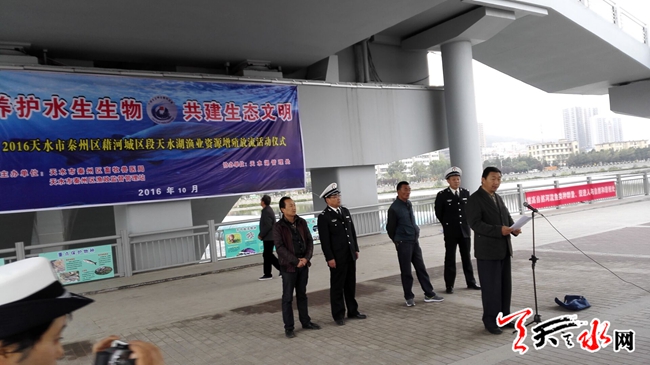 天天天水网24日15时讯 【记者 杨晓斌】2016天水市秦州区藉河城区段天水湖渔业资源增殖放流活动在天水湖1号坝库区进行。该活动由天水市秦州区畜牧兽医局,天水市秦州区渔政监督管理站主办,天水湖管理处协办。