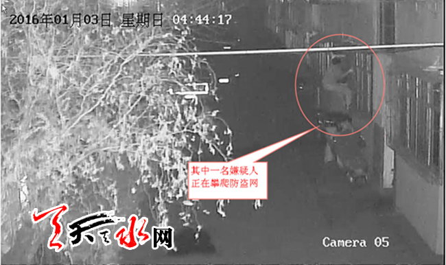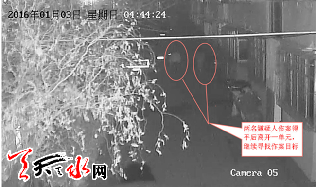 接到报警后,办案民警分析案情并联系其他派出所,通过对近期各派出所辖区盗窃案的分析、串并,通过对嫌疑人作案手法,时间的推断:各辖区近期盗窃案很有可能系同一人或同一伙人所为,可并案侦查。随后办案民警出动,调取了二一三小区家属院视频发现,2016年1月3日凌晨4时30分许,两名嫌疑人来到麦积区二一三小区家属院。