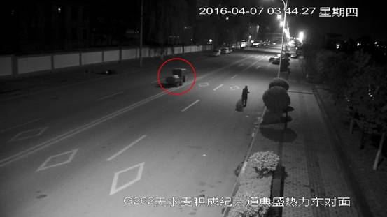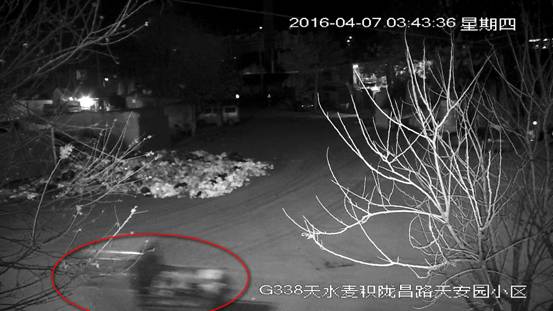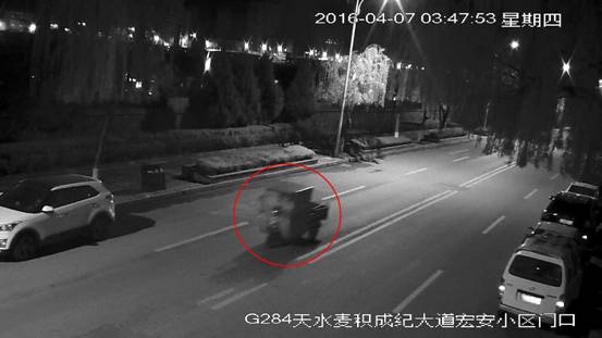 2016年4月7日3时47分犯罪嫌疑人在麦积区道南天安苑盗窃一辆电动三轮车后驾驶被盗车辆经过宏安小区。