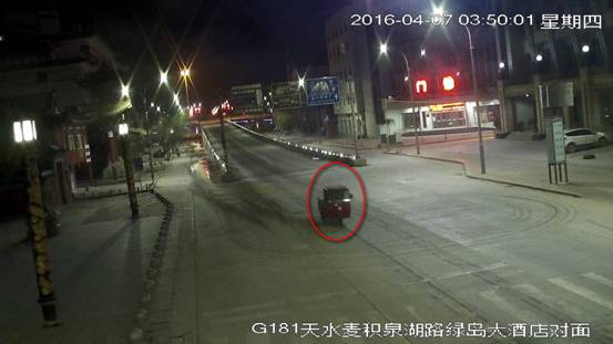 2016年4月7日3时50分犯罪嫌疑人在麦积区道南天安苑盗窃一辆电动三轮车后驾驶被盗车辆经过绿岛大酒店向南逃跑。