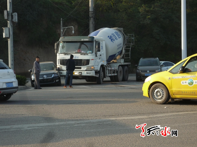 天天天水网31日8时讯【记者蔚军平】10月31日8时许,在秦州区迎宾桥南侧路口,发生一起交通事故。一辆商砼车在转弯时,其前右侧与一辆黑色轿车的左侧发生相撞,两车均有不同程度受损。