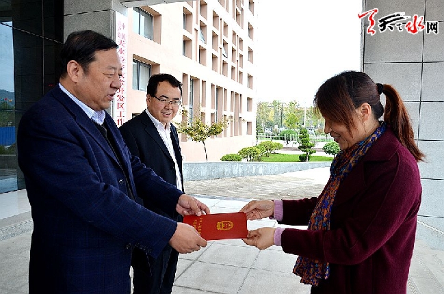 10月25日下午,天水经济开发区为辖区企业长城电工天水物流有限公司、天水市中西医结合医院、甘肃陇鼎建设工程公司等单位颁发了首批不动产权证书,这标志着开发区结束了土地、房产等不动产分散登记的历史,不动产登记工作进入全面明晰产权、有效保护权益、维护交易安全、提高服务效率的崭新阶段。(天水日报记者邵兰霞 摄)