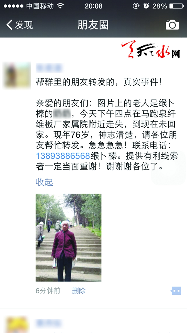 原来,10月27日下午4时,暂住在儿子家的王桂英老人下楼去散步,谁知道这一散步,便找不到回家的路了。下午5时左右,家人发现老人不见后,将附近的几个路口找了个遍,也没发现老人的身影。于是缑卜榛和家人一面发动身边的亲朋好友出门寻找,一面在微信群和微信朋友圈里发布了老人走失需要帮助的信息,并留下了姓名和电话号码。到了晚上,一位手机尾号为5895的热心市民打来电话说老人找到了,现在就在他身边。可这位市民刚和缑卜榛讲清他们所在的位置,一转眼儿老人又不见了……于是,一家人刚燃起的希望又破灭了。直到28日凌晨2点左右,一位开出租车的师傅给缑卜榛打来电话,称自己在麦积区峡口附近看见了老人,请他们不要着急,他会将老人送回家。缑卜榛表示,当他们看见老人安然无恙地回来后,都特别高兴,也特别感谢那位热心的司机师傅,想给他一点物质上的表示,可被拒绝了。而且那位师傅也没有留下自己的姓名,他们只记得出租车的车牌号为甘ET0319。