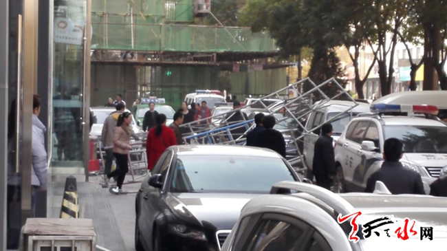 天天天水网14日17时讯【记者 杨晓斌】11月14日下午3时许,秦州区民主东路大城派出所附近,一个装修店面门头的施工点上,搭建了三层的脚手架突然倒塌。随着啪地一声金属撞击地面的较大的声响,脚手架散落一地,两名施工员应声掉落在地面。所幸掉落在地人员并未受伤。天天天水网在此提醒,施工同时,要把安全摆在首位。