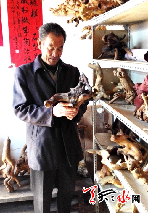 秦州区杨家寺镇士子村,有一位年过七旬的老汉,痴迷根雕四十余载。闲暇之余,老汉利用枯竭废弃的树根创作出上百件根雕作品,因技术精湛而远近闻名。