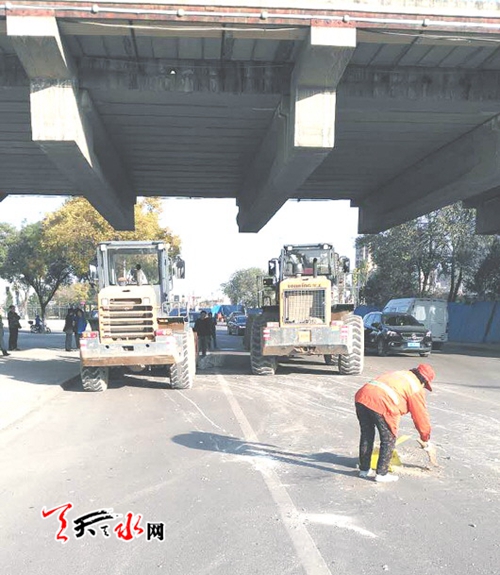 记者来到藉河北路迎宾大桥附近,只见从大桥下向西到便桥附近上百米长的路上,散铺着大大小小的尖角石料,两辆大型铲车正在和环卫工人一起清理石料。