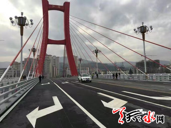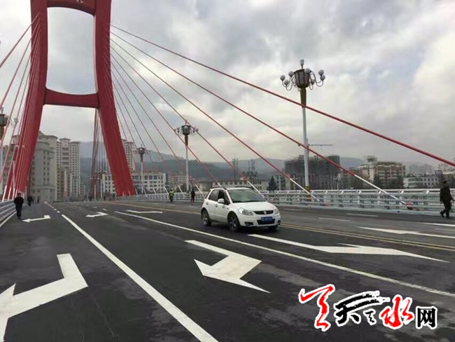 天天天水网15日12时讯【记者 王雪梅】11月15日中午,记者在秦州区藉河南路看到,我市地标型红桥开始正式通车。据了解,红桥修建历经一年8个月,于11月15日中午11点30分正式通车。