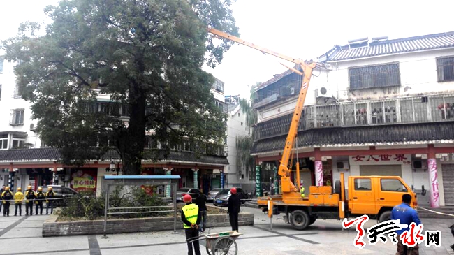 天天天水网17日10时讯 【记者 王雪梅】11月17日9时许,记者在秦州区中华东路看到,秦州区园林处的工人们正在修剪一颗百年面槐。记者了解到,目前为止这项工作已经进行了一周,每年修剪一次,老树枯枝和多余的枝叶都在修剪范围之内。