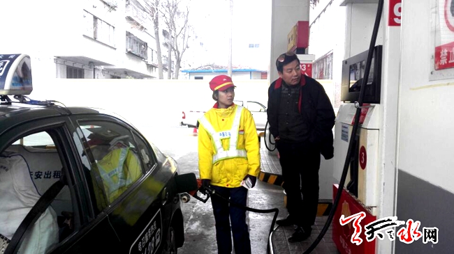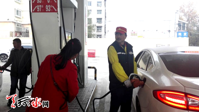 天天天水网17日10时讯 【记者 王雪梅】11月17日, 在秦州区新华路一加油站,工作人员正在给消费者加油。据了解,自16日零点起,国内油价迎来年内最大降幅:汽油每吨下调365元,柴油每吨下调355元。