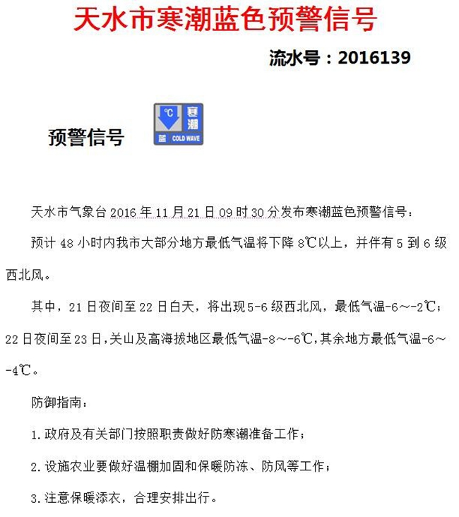 天水市气象台11月21日9时30分发布寒潮蓝色预警信号