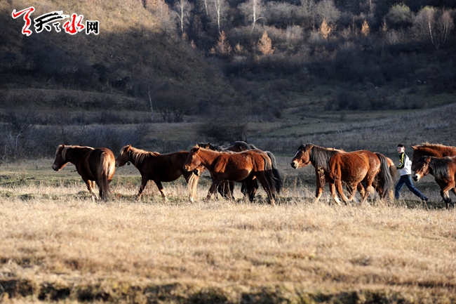 11月16日,夕阳西下,矫健俊美的马儿奔驰在清水县秦亭镇盘龙牧场上。该镇依托独特的地理环境和畜草资源,组织群众大力发展畜牧养殖业,有效增加了群众收入。(天水日报记者周文涛 摄)