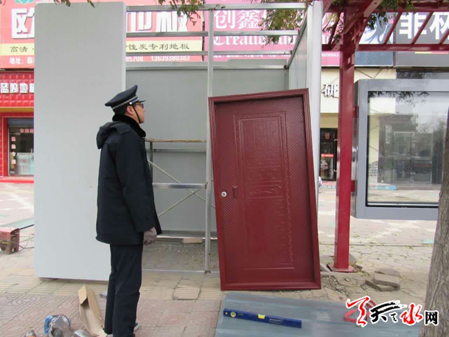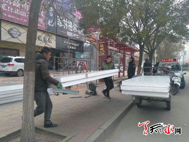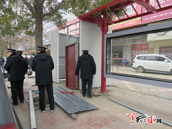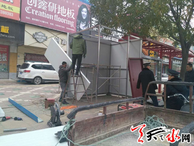 天天天水网讯【记者杨旭 通讯员周维元】11月24日,秦州区行政执法局机动二中队,对羲皇大道七里墩建材市场门口站台前一私搭乱建彩钢建筑进行了拆除。