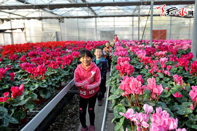 初冬时节,孩子们在天水国家农业科技园区参观“仙客来”鲜花。经过10余年的建设和发展,天水国家农业科技园区已形成航天种业、特色果蔬、循环农业三大产业链,成为了具备技术创新、科技示范、产业孵化、培训交流、辐射带动、旅游观光六大功能的多功能现代农业园区。(天天天水网记者孙镇 摄)