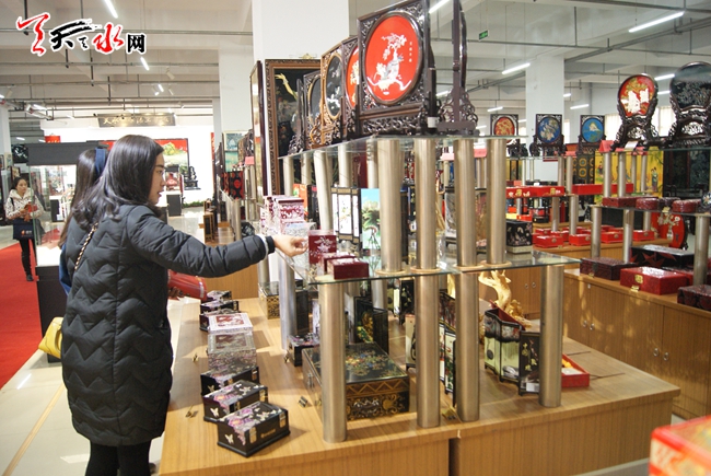 11月27日,市民在参观天水飞天雕漆产品展厅展品。天水雕漆已有近百年历史,雕漆器具有200多种规格不同的产品,远销欧美、日本、东南亚等37个国家和地区,深受消费者喜爱。(天天天水网记者马哲 摄)