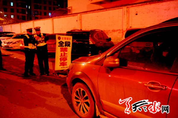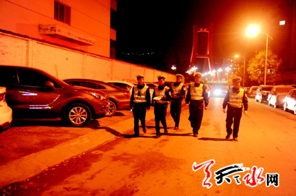 11月21日18:30,在人们下班后匆匆往家里赶的时候,我和秦州公安分局城区交警大队夜班中队的队员走进执勤路段,迎着寒风在路面上疏导交通,对违停车辆进行劝阻、处理。