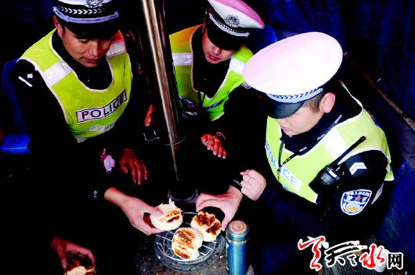 当然,也有令我们心存感动的赞许声。在天庆路,看见我们半夜里还在执勤,被堵车堵怕了的好多住户都会关切地问我们,“穿得够不够暖和”“吃过晚饭了没”“真辛苦,注意身体”……