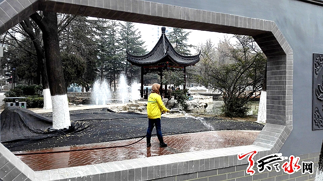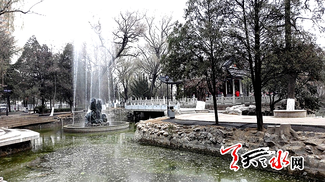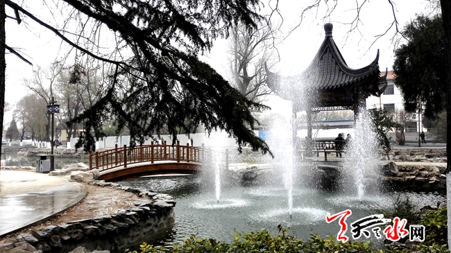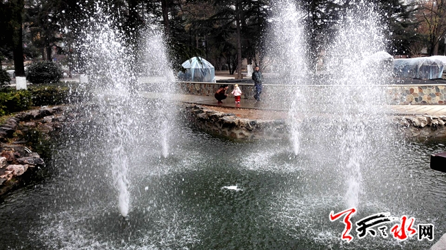 天天天水网14日11时讯【记者刘晓亚 通讯员王志成】12月13日下午,人民公园中山亭和西边木亭旁新建的两处喷泉全部开放,吸引着游人观看,许多人对冬天放喷泉表示不解,一名工作人员给大家解释:这些喷泉是新建的,现在放,一方面是检验喷泉工程的质量和效果,另一方面是这几天天水有扬尘,放喷泉有助于降尘防霾。