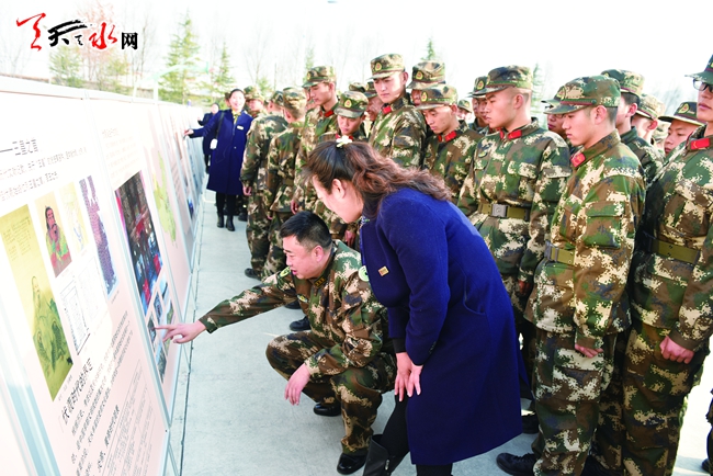 12月13日下午,武警天水市支队官兵正在观看市博物馆流动展览《一画开天 肇启文明——人祖伏羲精品展》。当天,天水市博物馆将最新伏羲文化原创流动展览30多块展板送进武警支队,选派4名优秀导游为该队200多名官兵现场讲解,让武警官兵更加了解天水优秀传统文化。(天天天水网记者杨璟 摄)