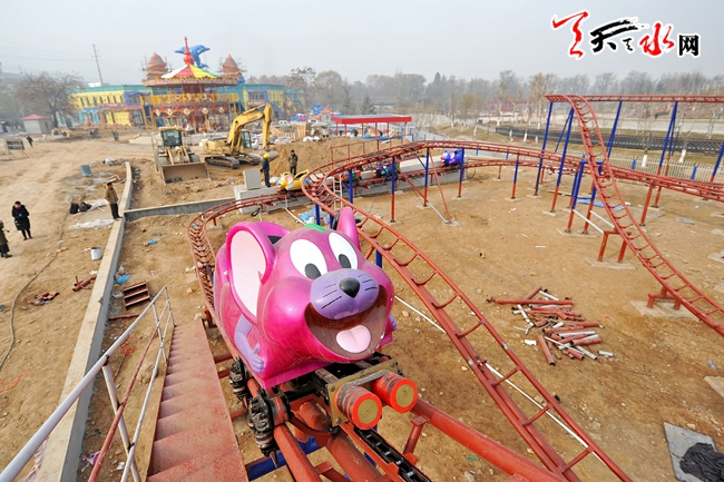 12月14日,工人正在安装调试马跑泉爱马欢乐世界的游乐设施。拥有四环过山车、65米高摩天轮、大摆锤、双层旋转木马等26套大型游乐设备的马跑泉爱马欢乐世界位于麦积区马跑泉公园南侧,预计2017年初开园迎客。(天天天水网记者孙镇 摄)