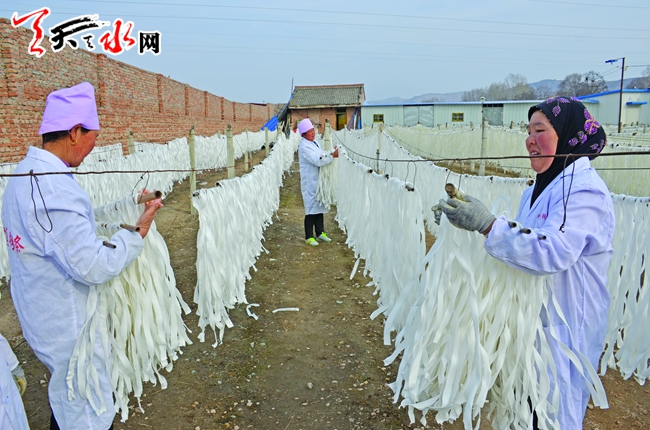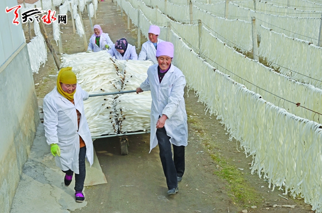 12月12日,张家川回族自治县伊真香清真淀粉制品有限公司的女工们在晾晒场上晾晒粉条。