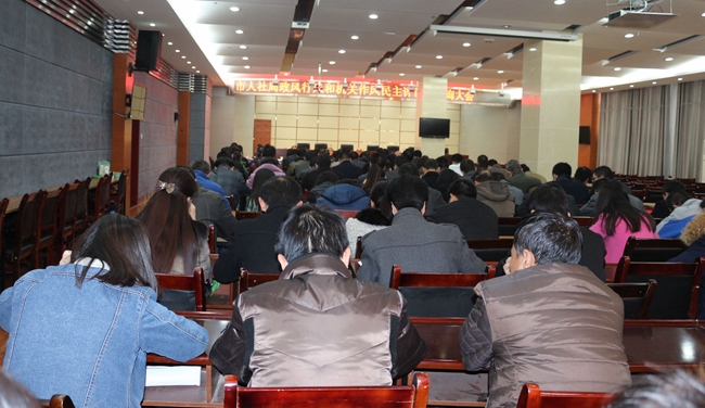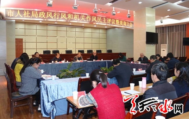 天天天水网讯(通讯员 张竞鸿 移红霞)12月9日下午,市人社局召开效能风暴行动民主评议政风行风和机关作风暨质询大会。会议由市行评第五组组长袁如平主持。市行评第五组组员张泽康、冯敬友同志,市效能办、市直机关工委宣教科科长成雪峰,市人社局聘请的行评监督员周成德、廖丽娟、王燕和各方面的服务对象代表,市人社局党委班子成员、局属各单位负责人、局机关及局属单位干部职工共130多人参加了会议。