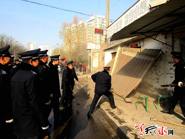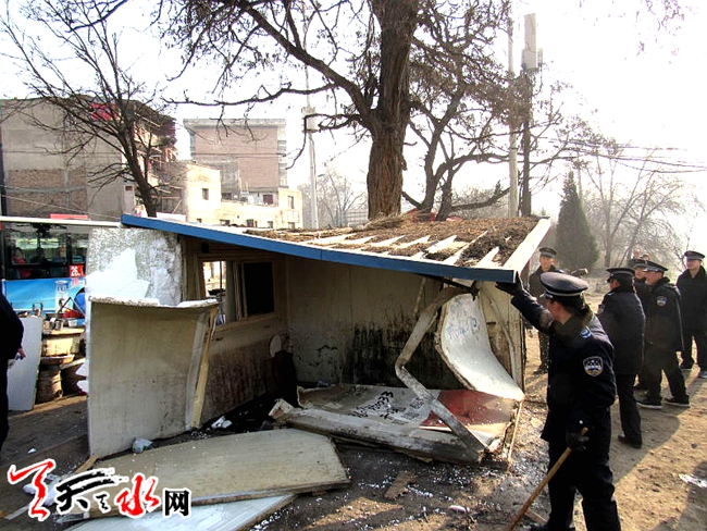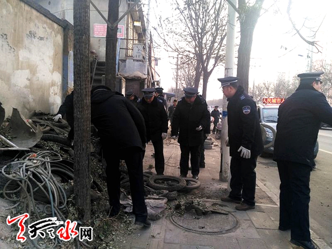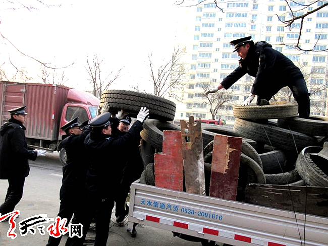 据了解,该中队根据秦州区环境卫生综合整治活动精神,积极召开会议安排部署,抽调中队人员连夜加班清理整治皇城路沿线乱堆乱放和长期无人使用的空闲铁皮房及简易棚房。经执法人员共同努力,拆除铁皮房2间,面积约10平方米;简易棚8家约120平方米;各类废旧轮胎650余条。目前全部清理完毕,使街区环境焕然一新,受到上级领导及周围群众的好评。